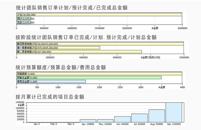 在VamCRM項(xiàng)目組合管理中集成項(xiàng)目數(shù)據(jù)的統(tǒng)計(jì)與分析,可以直接監(jiān)控項(xiàng)目計(jì)劃、預(yù)計(jì)及完成的項(xiàng)目數(shù)量、總金額和費(fèi)用的統(tǒng)計(jì),也可按月累計(jì)已完成的項(xiàng)目數(shù)量、總金額和費(fèi)用,直接衡量項(xiàng)目實(shí)施的結(jié)果與效益。在費(fèi)用管理模塊中集成費(fèi)用數(shù)據(jù)的統(tǒng)計(jì)與分析,對于所有費(fèi)用可以按人及費(fèi)用類型進(jìn)行統(tǒng)計(jì),實(shí)時知道哪一個人或哪一類費(fèi)用開銷最多,以及費(fèi)用與預(yù)算的對比分析。