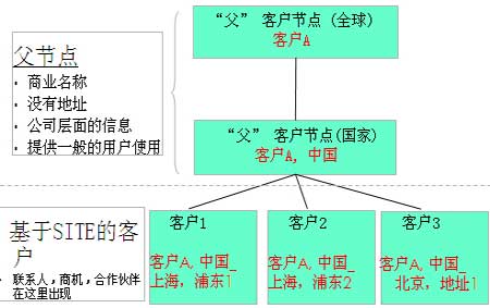 這樣對(duì)客戶的管理,尤其是對(duì)企業(yè)級(jí)客戶管理,造成了諸多不便,因?yàn)樵谂c客戶的商業(yè)行為,絕大多數(shù)時(shí)發(fā)生在SITE級(jí)別,就是與一個(gè)總公司的不同分公司的發(fā)生的交易行為。例如: