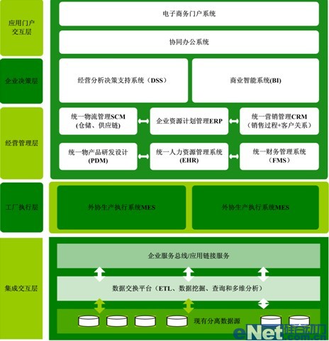 根據(jù)企業(yè)管理發(fā)展戰(zhàn)略及目標,需要考慮建設(shè)“集成化數(shù)字管控制造系統(tǒng)”,涵蓋企業(yè)決策層、企業(yè)經(jīng)營管理層。根據(jù)整體業(yè)務(wù)模式,企業(yè)經(jīng)營管理層又可以進一步分解為公司管理層和工廠執(zhí)行層;從信息化戰(zhàn)略支撐角度可以分解為企業(yè)門戶交互層、應(yīng)用系統(tǒng)層、應(yīng)用集成層和網(wǎng)絡(luò)支撐層。實現(xiàn)企業(yè)信息流、資金流、物流、商物流的高度集成、統(tǒng)一,為企業(yè)生產(chǎn)、經(jīng)營提供強有力的信息化支撐。