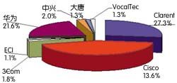 從圖3可以看出, Cisco、Clarent 和華為已經(jīng)成為我國IP電話設備市場的主要供應商。 Cisco利用其路由器網(wǎng)覆蓋范圍廣的優(yōu)勢,推動VoIP產(chǎn)品不但在全球取得了較好的成功,在我國市場也成為領先者之一; VocalTec作為最早倡導IP電話的領先者,也是最早進入我國VoIP市場的供應商之一,但隨著競爭對手的參與和壯大,其市場份額出現(xiàn)下滑趨勢;同樣是作為VoIP供應商的 Clarent,在我國市場中不斷調整產(chǎn)品體系和市場策略,其市場份額呈現(xiàn)大幅度上升態(tài)勢,和華為一道成為Cisco的強勁對手;華為作為我國通信產(chǎn)業(yè)的優(yōu)秀代表,利用自身的品牌優(yōu)勢和本地化優(yōu)勢,通過在我國程控交換機網(wǎng)上的領先地位,迅速進入了我國IP電話設備市場,很快提高了在IP電話設備市場的份額。