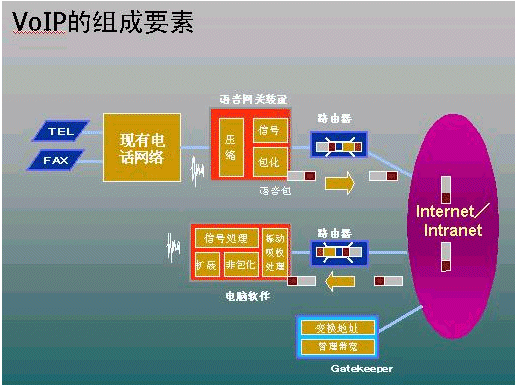 原理如下圖所示。發(fā)出信息端語(yǔ)音網(wǎng)關(guān)首先將語(yǔ)音和傳真信息數(shù)字化,然后再壓縮處理變?yōu)閴嚎s數(shù)據(jù)包在TCP/IP網(wǎng)絡(luò)中傳輸。接收端語(yǔ)音網(wǎng)關(guān)則將壓縮數(shù)據(jù)包先解壓,然后準(zhǔn)確地轉(zhuǎn)換成語(yǔ)音和傳真信息。在撥號(hào)端語(yǔ)音網(wǎng)關(guān)將你所撥打的電話號(hào)碼轉(zhuǎn)換成IP地址,而接收端則將IP地址轉(zhuǎn)換成電話號(hào)碼。語(yǔ)音網(wǎng)關(guān)與公用電話網(wǎng)(PSTN)、交換機(jī)(PBX)、集團(tuán)電話(KTS)和IP網(wǎng)絡(luò)無(wú)縫集成。