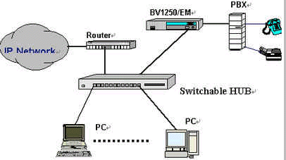 OKI公司的IVG BV1250互聯(lián)網(wǎng)絡(luò)IP電話語(yǔ)音網(wǎng)關(guān)就是一種非常好的選擇,完全基于H.323 Ver2.0協(xié)議,實(shí)現(xiàn)語(yǔ)音和傳真在因特網(wǎng)上傳輸。使用BV1250 進(jìn)行IP電話和IP FAX通信時(shí),可以感覺(jué)到與傳統(tǒng)的電話或傳真所提供的服務(wù)毫無(wú)區(qū)別。運(yùn)用BV1250,可通過(guò)互聯(lián)網(wǎng)(Internet/Intranet)將電話機(jī)、傳真機(jī)和PBX進(jìn)行互連,建立專用的IP電話網(wǎng)絡(luò)。BV1250使用的是靜態(tài)IP地址,因此不能將BV1250連接到使用DHCP(動(dòng)態(tài)主機(jī)通信規(guī)程)的互聯(lián)網(wǎng)上。常用連接方式如下圖所示: