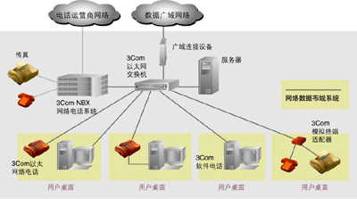 經(jīng)過一番論證之后,CSM公司最終采納了陳東的提議。通過一段時(shí)間的比較,選擇了3Com公司的NBX100網(wǎng)絡(luò)電話系統(tǒng),其終端用戶數(shù)為120部。同絕大多數(shù)企業(yè)一樣,CSM公司原來的通信系統(tǒng)由2大部分組成,即由模擬電話交換機(jī)PBX為核心的語音系統(tǒng)和以太網(wǎng)交換為核心的數(shù)據(jù)通信系統(tǒng)。而利用VoIP技術(shù)則可以將語音與數(shù)據(jù)統(tǒng)一于以太網(wǎng)之中(參見圖2)。首先,網(wǎng)絡(luò)電話將通話人的模擬信號(hào)轉(zhuǎn)化為數(shù)字信號(hào),并通過網(wǎng)線傳輸?shù)揭蕴W(wǎng)交換機(jī)中,然后再轉(zhuǎn)送到網(wǎng)絡(luò)電話系統(tǒng)。如果和企業(yè)外部通話,則需要實(shí)現(xiàn)傳統(tǒng)的電話網(wǎng)絡(luò)的電路交換方式與IP交換方式之間的轉(zhuǎn)換,并完成數(shù)字信號(hào)和模擬信號(hào)的轉(zhuǎn)換,再與電話運(yùn)營商的網(wǎng)絡(luò)進(jìn)行連接;如果在企業(yè)內(nèi)部通話,則通過以太網(wǎng)交換機(jī)轉(zhuǎn)接到內(nèi)部。