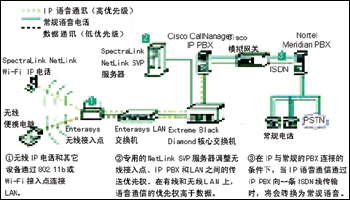 PBX,利用IP將一些遠(yuǎn)程設(shè)備與一臺Nortel的Meridian PBX連接起來,構(gòu)成語音網(wǎng)絡(luò)。在USCUH選擇為醫(yī)護(hù)人員配發(fā)WLAN電話時(shí),兩個(gè)網(wǎng)絡(luò)合并到了一起。為保證語音質(zhì)量,醫(yī)院利用SpectraLink的NetLink