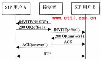 本流程中,控制者向A發(fā)送一個沒有SDP的INVITE。A應答的200 OK響應中包含一個offerl,控制者立即在ACK消息中產生一個“黑洞”SDP應答。