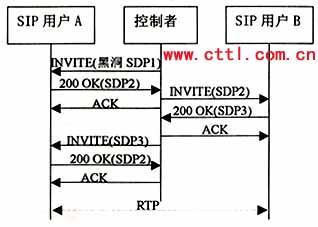 該流程中,控制者首先向用戶A發(fā)送INVITE,包含SDP1,用來創(chuàng)建一個初始的“黑洞”媒體流,A振鈴并產生應答記為SDP2,其中包含的是一個有效的連接地址,但此時仍沒有媒體流向控制者?刂普呦駻發(fā)出ACK。