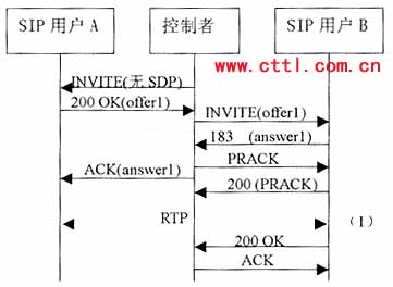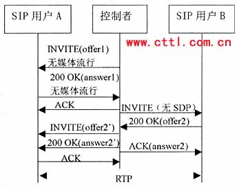 控制者再向B發(fā)送一個沒有SDP的INVITE。B應答的200 0K響應中包含一個提供offer2,控制者應該基于offer2向A發(fā)送一個re-INVITE,注意。offer2可能需要稍作修改來滿足媒體要求。例如如果offer1包含一個音頻和一個視頻行,而offer2只有一個音頻行,控制者就需要在offer2中增加一個視頻行(端口設為O)來構成offer2’。由于這是一個re-INVITE,所以通常應該能立即收到響應。A的200