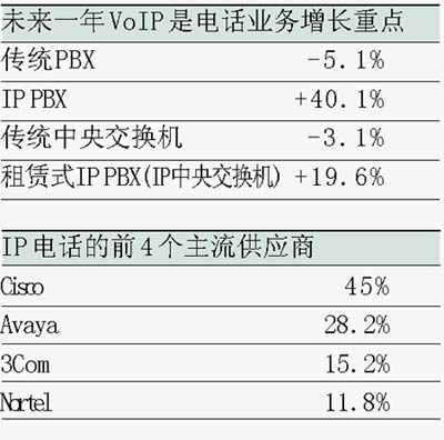 事實(shí)上,北美市場(chǎng)的實(shí)際銷(xiāo)售量已經(jīng)表明,市場(chǎng)中的傳統(tǒng)語(yǔ)音交換機(jī)銷(xiāo)售量已經(jīng)在明顯下降,而具備IP功能或純IP系統(tǒng)的銷(xiāo)售量卻在穩(wěn)步上升。Gartner 預(yù)計(jì),2005年在北美地區(qū)銷(xiāo)售的純IP系統(tǒng)總價(jià)值將高達(dá)9.03億美元,比2004年的6.86億美元上升32%。同時(shí),傳統(tǒng)電路交換系統(tǒng)的銷(xiāo)售量將從2004年的14億美元下降至9.99億美元,下降的幅度是32%。而混合式系統(tǒng)的銷(xiāo)量增長(zhǎng)幅度可望達(dá)到30%,也就是說(shuō),從2004年的1.5億美元增長(zhǎng)到2005年的2億美元。