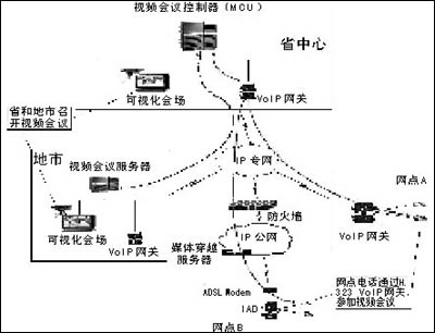 通過在全省部署VoIP系統(tǒng),網(wǎng)點VoIP網(wǎng)關(guān)可以通過H.245協(xié)議與視頻會議MCU(多點控制器)進(jìn)行通信能力的動態(tài)協(xié)商,在國家、省和地市召開視頻會議時,網(wǎng)點可以通過普通電話(或者電話會議終端)參與會議,實現(xiàn)“聽聲參會”,低成本地實現(xiàn)了行業(yè)視頻會議系統(tǒng)的延伸。