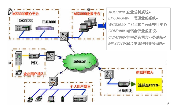 MS3000基于NGN交換技術(shù),在以軟交換技術(shù)為基礎(chǔ)的呼叫控制中心平臺(tái)上提供獨(dú)立的、多種形式的電信增值業(yè)務(wù)。