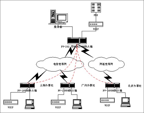 VPN防火墻網(wǎng)關具有雙WAN口和QOS帶寬管理功能,總部同時接入兩條ADSL線路,通過策略路由,把內(nèi)部網(wǎng)絡的上網(wǎng)訪問全部從WAN2的ADSL上網(wǎng),而把VOIP和VPN全部通過WAN1的ADSL來傳輸,從而避免了上網(wǎng)的請求占用VPN和VOIP的帶寬。同時,通過對內(nèi)部網(wǎng)絡不同的業(yè)務劃分不同的優(yōu)先級,特別是把VOIP的優(yōu)先級做為最高,優(yōu)先轉發(fā)VOIP的數(shù)據(jù)包,同時又通過VOIP和VPN傳輸分配最大和最小的保證帶寬,來保護VOIP業(yè)務的正常通信。除此之外,F(xiàn)V-202強大的訪問控制功能,特別是對VPN隧道的訪問控制功能,可以對各地的分公司通過VPN訪問總公司的服務器進行控制,為不同的客戶分配不同的權限,讓遠程的VPN隧道只能訪問指定的IP地址或相關的業(yè)務端口,能很好保證VPN的訪問安全。特別值得一提的是,F(xiàn)V-202支持網(wǎng)通、電信雙線路接入,如果由于北方網(wǎng)通跨網(wǎng)接入,可以在全部申請網(wǎng)通線路,把北方的分支機構接入到總部的網(wǎng)通線路,可以避免由于跨網(wǎng)帶來的帶寬瓶頸。在各個分支機構配置iRouter的FV-20VPN防火墻,為各個分支機構構建一道安全的防線,實現(xiàn)與總部的VPN的聯(lián)接。同時,外出的員工或領導通過IPSEC的撥號軟件,實現(xiàn)移動的接入,通過VPN,東莞奧愛斯構建全國的融合的安全通信平臺,既可以解決VOIP的被竊聽的風險,又能實現(xiàn)實時的數(shù)據(jù)訪問。從而大大地降低公司長途的話費和以往租用數(shù)據(jù)專線的高昂的費用,提高了公司的工作效率,為公司帶來十分明顯的經(jīng)濟效益。