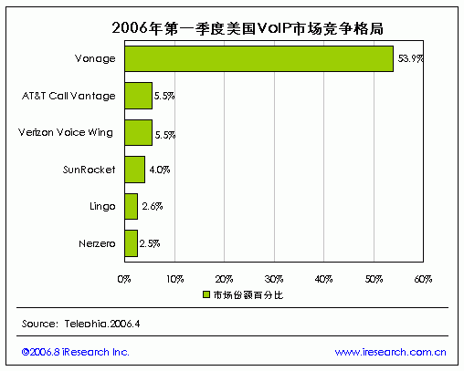 iResearch艾瑞市場咨詢根據美國融合通信和移動通信行業(yè)市場調查公司Telephia統(tǒng)計數據顯示,在純VoIP服務市場上,Vonage公司擁有53.9%的市場份額,在市場份額排名上仍位居第一。并列第二位的有兩個公司,為Verizon Voice Wing公司和AT&T Call Vantage公司,市場份額均為5.5%,隨后的是SunRocket市場份額4%,Lingo2.6%,和NetZero Voice2.5%。