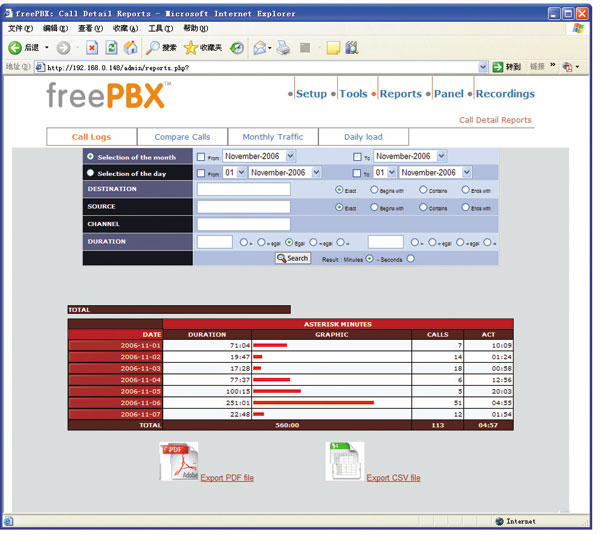 使用Trixbox的統(tǒng)計(jì)報(bào)告功能(如圖5所示),用戶(hù)能夠察看在一個(gè)時(shí)間段內(nèi)的通話(huà)統(tǒng)計(jì)數(shù)據(jù),例如呼叫建立總數(shù)、呼叫平均時(shí)長(zhǎng)、失敗呼叫比例等等,當(dāng)然也能夠察看每個(gè)呼叫的主叫/被叫號(hào)碼,以及呼叫發(fā)生的具體時(shí)間。