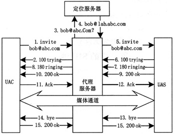 URI地址,建議利用DNS系統(tǒng),解析該地址得到該域中SIP代理服務(wù)器地址,信令到達(dá)該服務(wù)器后,再查詢該域中的位置登記服務(wù)器,即可定位到被叫用戶當(dāng)前所在地址。