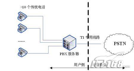 相反,在傳統(tǒng)的PBX或新興的IP-PBX中,這些功能模塊通常配置在用戶側的網絡元素上,而且通過一條或多條專用線路T1(傳統(tǒng)PBX)或DSL(新興PBX)連接到中心辦公室,用PSTN的連接。圖1說明了PBX和Centrex服務的區(qū)別。而且,DSL還能在相同的鏈路支持語音和數(shù)據的傳輸,而且維護鏈路的成本也遠遠小于維護T1所需的代價。另外,由于呼叫控制能夠在本地裝載,而IP-PBX能夠支持Internet連接,因此每23(T1-PRI)或24(T1-CAS)個電話終端就不再需要一條專用線路T1的支持了。(后續(xù)將進一步說明)
