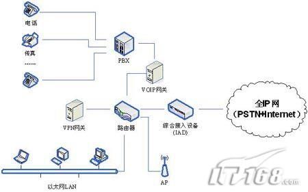 IP-PBX或者分組語(yǔ)音交換(PVX),以及綜合接入設(shè)備(IAD),從而取代傳統(tǒng)的PBX和終端。IAD通常支持基于DSL的業(yè)務(wù),因此部署時(shí)不需要多個(gè)物理線路的開銷,因?yàn)橐粭l來自IAD的物理線路能夠支持多個(gè)虛擬電路。PVX可以處理各種分組話音服務(wù),而且可以避免升級(jí)和互操作性的問題。