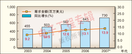 5.IP電話信號(hào)轉(zhuǎn)換設(shè)備市場(chǎng)需求將不斷增長(zhǎng)。2006年,中國(guó)大陸IP電話信號(hào)轉(zhuǎn)換設(shè)備的總需求規(guī)模為6.41億美元,同比增長(zhǎng)13.1%;預(yù)計(jì)今年的總規(guī)模將達(dá)7.3億美元,同比增長(zhǎng)13.9%(見圖6)。