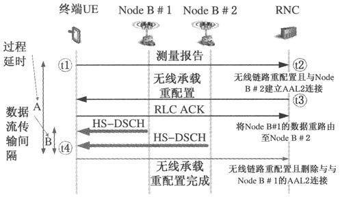 對于下面的延時分析,我們假設信令無線承載(SRB)在下行映射到HS-DSCH信道上,在上行映射到增強上行鏈路專用信道(E-DCH)上,且TTI均為10ms。HS-DSCH是HSDPA的傳輸信道,E-DCH是HSUPA的傳輸信道。首先,當滿足測量觸發(fā)事件1d(最優(yōu)小區(qū)改變)時,UE在信令無線承載上發(fā)送測量報告。傳輸從t1開始,RNC在t2時刻接收到消息。服務RNC將為目標NodeB保留基站資源和Iub資源。該資源的預留通過使用預配置可以完成得非常快。一旦資源在t3時刻準備好,RNC將向UE發(fā)送無線承載重配置消息,此時UE還是從源NodeB中接收數據。當UE對重配置消息進行解碼,并且在有效時刻t4到期前,UE接收數據將從源小區(qū)切換到目標小區(qū)。UE開始監(jiān)聽目標小區(qū)的高速共享控制信道(HS-SCCH),HS-SCCH是HSDPA下行的共享控制信道。UE也會測量目標小區(qū)的信道質量,并發(fā)送目標小區(qū)的CQI報告。源小區(qū)該用戶的MAC-hs在小區(qū)切換后將重置,并將緩存的協議數據單元(PDU)刪除。同時目標小區(qū)MAC-hs中的流控單元開始從服務RNC中請求PDU,這樣便可以通過HS-DSCH向用戶發(fā)送數據。在小區(qū)切換過程中,RNC可以同時向兩個Node