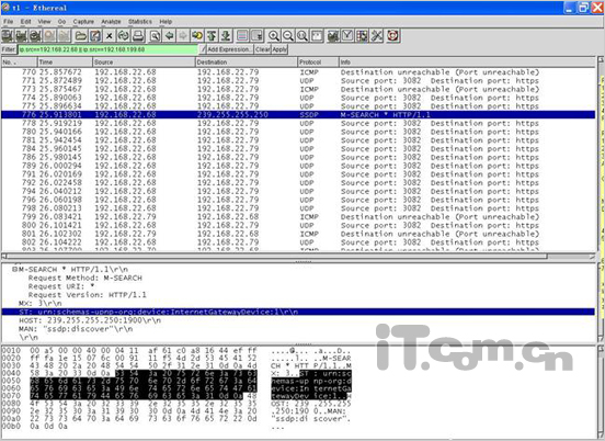 分析結(jié)果:除了可以看到有UPnP協(xié)議,DHCP發(fā)現(xiàn)協(xié)議等網(wǎng)絡(luò)協(xié)議外沒有發(fā)現(xiàn)任何已知的VoIP協(xié)議且協(xié)議被加密。加密技術(shù)和Skype類似,每一次通話使用的端口都不相同。