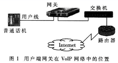 近年來隨著寬帶網(wǎng)絡(luò)和IP技術(shù)的日益發(fā)展,VoIP>(Volee over Internet Protoc01)技術(shù)的應(yīng)用越來越廣泛。網(wǎng)關(guān)是VoIP網(wǎng)絡(luò)中的重要設(shè)備,按照應(yīng)用領(lǐng)域可分為電信級網(wǎng)關(guān)和用戶端網(wǎng)關(guān)。用戶端網(wǎng)關(guān)設(shè)備主要應(yīng)用于小區(qū)和企業(yè),是連接終端電話和IP網(wǎng)絡(luò)的橋梁,主要功能是進行語音編解碼、信令處理、VoIP協(xié)議處理和路由協(xié)議處理等。用戶端網(wǎng)關(guān)設(shè)備在VoIP網(wǎng)絡(luò)中的位置如圖1所示。可以看出,網(wǎng)關(guān)處于用戶電話線路部分的末端、IP網(wǎng)絡(luò)部分的起始端。