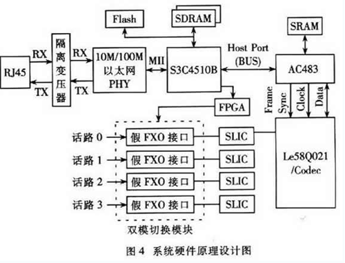 本節(jié)提出了一種基于H.323的雙模網(wǎng)關(guān)的系統(tǒng)設(shè)計方案,該方案支持4路話音,使用一種經(jīng)濟實用的“假FXO接口”方式實現(xiàn)雙模切換,能夠在VoIP通話時檢測到PSTN線上進來的呼叫并可通過按話機的拍簧或者Flash閃斷鍵切換接聽。