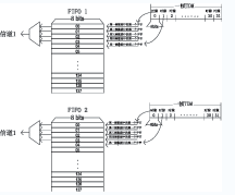FIFO中的四幀數(shù)據(jù)被讀空時(shí)間大于第五幀的第一個(gè)字節(jié)寫入FIFO的準(zhǔn)備時(shí)間,F(xiàn)IFO的寫滿與讀空都是有硬件產(chǎn)生信號(hào)標(biāo)識(shí),此時(shí)FIFO讀空信號(hào)標(biāo)識(shí)未產(chǎn)生,不能對(duì)同一FIFO進(jìn)行寫操作,導(dǎo)致待寫數(shù)據(jù)丟失。因此選用兩個(gè)FIFO采用乒乓機(jī)制來(lái)切換讀寫操作,如圖4所示。
