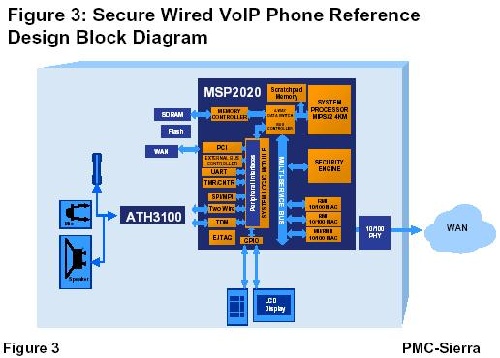 PMC-Sierra的MSP2020是VoIP電話參考平臺(tái)的基礎(chǔ),可以使具備安全特性的VoIP產(chǎn)品在價(jià)格和性能上都達(dá)到新的高度。MSP2020不需要單獨(dú)的處理器、語(yǔ)音處理DSP、安全芯片以及多個(gè)以太網(wǎng)MAC,其全集成式設(shè)計(jì)簡(jiǎn)化了電話設(shè)計(jì)復(fù)雜性,使整個(gè)產(chǎn)品成本(BOM)減少,可以讓OEM與服務(wù)提供商迅速向市場(chǎng)提供差異化VoIP電話產(chǎn)品。