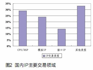根據(jù)對國內(nèi)IC設計公司的調(diào)查,主要的IP應用領域集中在以下幾個范圍:數(shù)字音視頻、移動通信和無線通信、汽車電子、信息家電、信息安全和3C融合。根據(jù)CSIP的IP需求調(diào)查,IP交易領域主要集中在三個方面:一是開發(fā)難度較大和應用復雜的高端CPU和DSP;二是標準的接口IP(例如USB接口、PCI Express等);三是模擬IP(如PLL,ADC等)。這三類IP需求占到總需求的一半多。而其他的交易類型如標準的內(nèi)存模塊,以及一些面向特殊應用的IP,則占據(jù)國內(nèi)需求的三分之一(見圖2)。