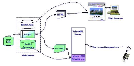 VoiceXml 1.0規(guī)范基于W3C的工業(yè)標準XML,為語音和電話應(yīng)用的開發(fā)者,服務(wù)提供商和設(shè)備制造商提供了一個智能化的API。VoiceXml的標準將簡化WEB上具有語音響音服務(wù)的個性化界面的創(chuàng)建,使人們能夠通過語音和電話訪問網(wǎng)站上的信息和服務(wù),同時與CGI(PERL,PHP,C,JAVA SERVLET等)的腳本結(jié)合在一起來檢索后臺數(shù)據(jù)庫,訪問企業(yè)內(nèi)部網(wǎng),從而最終將語音瀏覽器與微型瀏覽器融合在一起,實現(xiàn)計算機網(wǎng)絡(luò)與電話技術(shù)的完美結(jié)合。其具體的系統(tǒng)結(jié)構(gòu)如下: