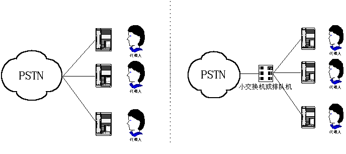 呼叫中心,早期是指一個由兩人或更多人組成的、在一個特定地方用專用設(shè)備處理電話業(yè)務(wù)的小組。這些人就是通常所說的呼叫中心代理(人)。一個呼叫中心可以只提供信息接收服務(wù),或者只提供信息發(fā)送服務(wù),或者是一個混合式呼叫中心,其呼叫中心代理會負(fù)責(zé)所有這兩項工作。從物理設(shè)備構(gòu)成來看,第一代呼叫中心可用下圖(1)、(2)表示。