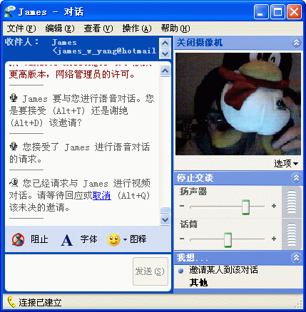 單擊對(duì)話框右邊的“啟動(dòng)攝像機(jī)”和“開(kāi)始交談”,系統(tǒng)會(huì)提示你正在等待對(duì)方回應(yīng)視頻或語(yǔ)音對(duì)話的邀請(qǐng),對(duì)方接受,就開(kāi)始進(jìn)行視頻通話(見(jiàn)圖11)。如果雙方都有攝像頭,你還可以通過(guò)視頻框下面的“選項(xiàng)”將自己的影像設(shè)為畫中畫的功能。