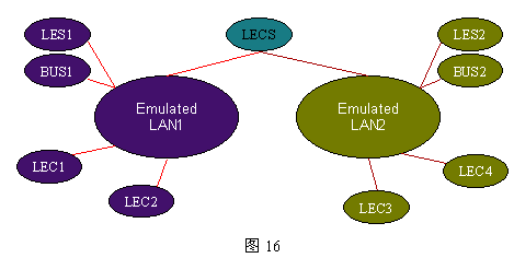 每個(gè)ELAN(Emulated LAN)由一組LANE客戶(LEC)和LANE服務(wù)構(gòu)成。LEC還可以是作為ATM主機(jī)代理的網(wǎng)橋和路由器。LE服務(wù)由三個(gè)不同的功能實(shí)體構(gòu)成:LAN仿真配置服務(wù)器(LECS)、LAN服務(wù)器(LES)和BUS,這三個(gè)服務(wù)實(shí)體可以各自存在,但通常位于同一設(shè)備,例如:LES可以位于ATM交換機(jī)、路由器、網(wǎng)橋和工作站。ATM LANE的構(gòu)成及相互關(guān)系如下圖16所示: