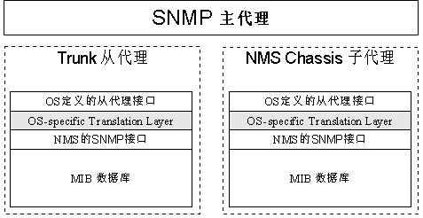SNMP采用了Client/Server模型的特殊形式:代理/管理站模型。對(duì)網(wǎng)絡(luò)的管理與維護(hù)是通過管理工作站SNMP代理間的交互工作完成的。每個(gè)SNMP從代理負(fù)責(zé)回答SNMP管理工作站(主代理)關(guān)于MIB定義信息的各種查詢。下圖10NMS公司網(wǎng)絡(luò)產(chǎn)品中SNMP協(xié)議的實(shí)現(xiàn)模型。