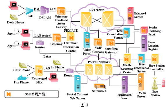 其具體技術(shù)內(nèi)容包括:語(yǔ)音IP (VoIP)、語(yǔ)音DSL (VoDSL)和語(yǔ)音無(wú)線本地環(huán)路(VoWLL);以及用于確保IP語(yǔ)音、視頻和數(shù)據(jù)通信性能的其他技術(shù)。圖1顯示了NMS公司的產(chǎn)品在整個(gè)通信應(yīng)用(包含PSTN網(wǎng)絡(luò)和IP分組網(wǎng)絡(luò))中的位置。