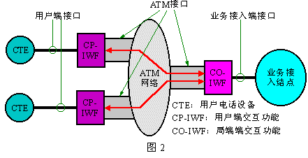 下圖2是VoATM的參考模型。其中的CTE為用戶電話終端設備,“業(yè)務接入結點”是指用戶電話業(yè)務的提供網(wǎng)絡在ATM網(wǎng)絡側的界;其中的CP-IWF完成用戶電路和ATM網(wǎng)絡的協(xié)作功能,而CO-IWF則完成ATM網(wǎng)絡和業(yè)務網(wǎng)絡的協(xié)作功能。