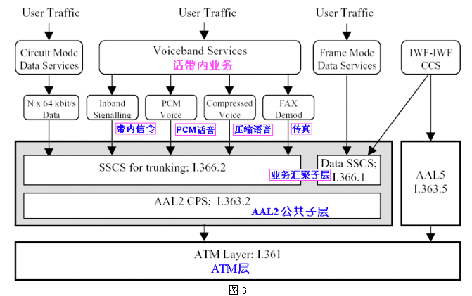下圖3給出了VoATM的協(xié)議結構模型(來源:AF-VMOA-0145-000:ATM論壇ATM Forum)。這是一個基于AAL2進行話帶話音及多媒體業(yè)務傳送的協(xié)議框架。在ATM論壇標準中,被稱為環(huán)路仿真業(yè)務(LES:Loop Emulation Service),和傳統(tǒng)PSTN不同的是采用很大新技術以充分利用傳送帶寬: