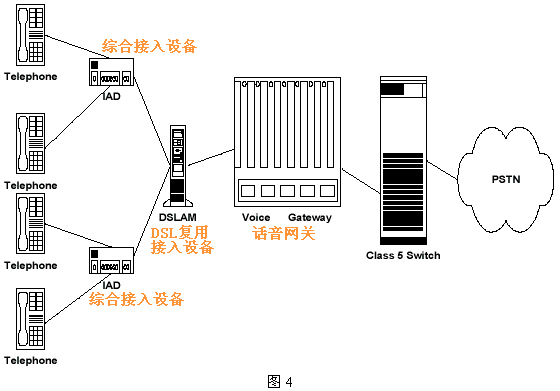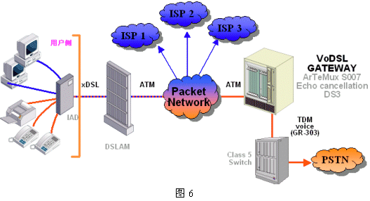 圖4給出了BLES的邏輯結(jié)構(gòu)。這種方式下,VoDSL廠商必須設(shè)計(jì)開發(fā)用于和已有的用戶設(shè)備、DSL網(wǎng)絡(luò)及Class 5交換機(jī)互通的接口設(shè)備;用戶側(cè)設(shè)備IAD為數(shù)據(jù)傳輸提供了Ethernet和ATM接口,為話音傳送提供了一定數(shù)量的模擬用戶線接口,每一接口都被分配了唯一的DSL電路。話音網(wǎng)關(guān)和Class 5交換機(jī)間的接口協(xié)議,在美國(guó)等地區(qū)采用GR-303和TR-08標(biāo)準(zhǔn),而在歐洲標(biāo)準(zhǔn)中使用V5.2接口。參見后面的圖6。
