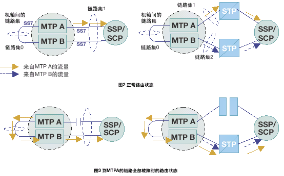 當連接到MTP A或連接到 MTP B的所有鏈路均發(fā)生故障時,訊息通過MTP A和MTP B之間的鏈路集發(fā)送到其它MTP,并由該MTP在可用的鏈路上重新發(fā)送。參見圖3。