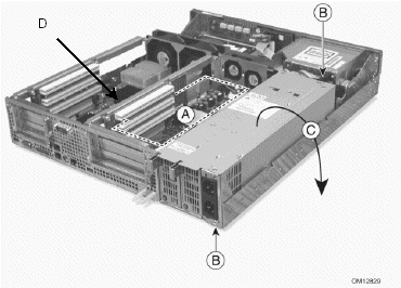 7. 抬起電源盒的基座,然后旋轉(zhuǎn)以便能將其放置到服務(wù)器單元外(這樣做不用斷開纜線,但操作時(shí)要小心,以保證纜線不受擠壓);