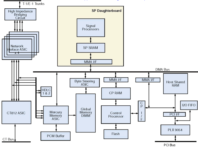 (T-1和E-1裝配有所不同) 兩塊子板上面各有一組DSP. 當開電時電話信令協(xié)議和語音處理功能被下載到板卡上. 在處理器上作為固件存在,