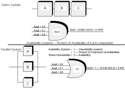 由于冗余被引入系統(tǒng),系統(tǒng)的可用特性發(fā)生了重大的改變。實用性計算變成了一種費力并且容易出錯的工作,因為計算必須考慮冗余的效果,失效切換到冗余組件的成功率,MTTR失效組件的效率及相似的問題。使用平臺和電話板塊MTTF數(shù)據(jù)作為輸入和使用可靠模塊圖(RBD)2以正確決定系統(tǒng)級別可用特性可以獲得更好的結果。