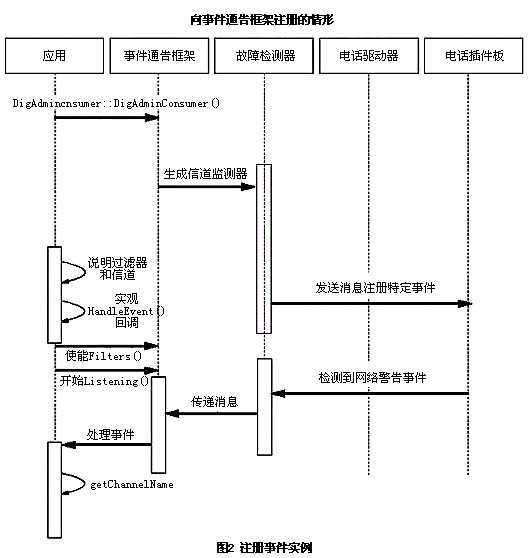。。系統(tǒng)版包括事件服務(wù)API和事件通告框架。這些API用來向事件通告框架注冊(cè)你的應(yīng)用。框架是使所有操作、管理、維護(hù)和定制服務(wù)(OAM&P)向已注冊(cè)的電話應(yīng)用發(fā)送異步消息的子系統(tǒng)。關(guān)于事件服務(wù)API和事件通告框架的詳細(xì)信息,可以參考系統(tǒng)版文檔中的編程指南?蚣芎胁煌诺,這些信道用來報(bào)告與操作人員的一些被動(dòng)或者主動(dòng)的動(dòng)作相關(guān)的事件。