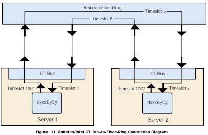 為了能夠共享時(shí)隙,將本地服務(wù)器上的CT總線連接到Amtelco光纖環(huán)路,然后從光纖環(huán)路連接到另外一個(gè)服務(wù)器的本地CT總線。圖11是一個(gè)簡單圖示,顯示了一個(gè)服務(wù)器1上的中間設(shè)備(dxxxBxCx)到另外一個(gè)服務(wù)器2上的中間設(shè)備(dxxxBxCx)的連接。