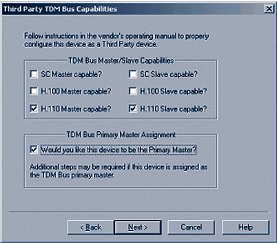 現(xiàn)在需要選擇合適的TDM總線的功能,對合適的類型(對于PCI,選擇H.100,對于CompactPCI,選擇H.110),您需要選擇主選項(xiàng)和客戶端選項(xiàng)。如果該設(shè)備將要為CT總線(客戶端服務(wù)器)提供主時(shí)鐘,選中TDM總線主控制選項(xiàng),然后單擊下一步。圖5顯示的是CompactPCI服務(wù)器在系統(tǒng)中配置為客戶端服務(wù)器的選擇。